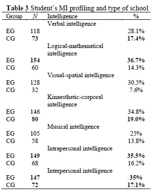 In our study, the logical-mathematical, intrapersonal and interpersonal intelligences were partially or completely developed in a higher proportion of students in the EG, which is in line with the results obtained by Ekinci (2014), who demonstrated that students aged 11 to 12 years whose education was based on Gardner's theory of MIs, develop the logical-mathematical, verbal and intrapersonal intelligences in a more solid way than peers taught using other methods. Similarly, Gutiérrez Sas, Fontenla Fariña, Cons Ferreiro, Rodríguez Fernández and Pazos Couto (2017) showed that workshops using MI-based methods led to improvements in intrapersonal and interpersonal intelligences that manifested as improvements in children's social skills, emotional intelligence, and self-esteem.