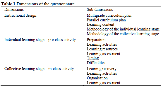 The data needed to answer the RQs were obtained through a questionnaire. Its structure corresponded to the phases of FC, and the items asked about teachers' practices when applying this methodology in their classes. The questionnaire is a frequent resource in descriptive research on FC (Goedhart, Blignaut-van Westrhenen, Moser & Zweekhorst, 2019; Murillo-Zamorano, Sánchez & Godoy-Caballero, 2019), and also in studies that delve into the learning experiences of multigrade classes (Casserly & Padden, 2018; Checchi & De Paola, 2018). Thence, in our discussion we focus more on the type of instrument and its design.