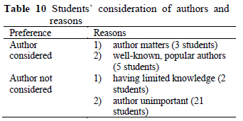 Twenty-three students stated that the author was not a priority in selection because they either did not consider authors to be important or did not have any knowledge about them. It may thus be deduced that as the students did not have sufficient experience in reading, they did not have an interest in any particular author. On the other hand, eight students stated that as there were authors they knew and liked, they primarily looked for books by those authors. They also considered authors recommended by teachers and their peers. The findings show that the students' familiarity with authors and the recommendations of their teachers and peers were influential in the selection of books. The students' considerations regarding author are presented in Table 10.