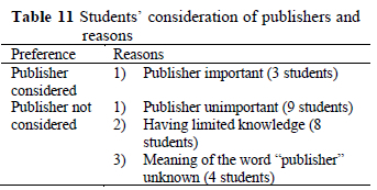 Twenty-one students reported that they did not consider the publisher important when selecting books. They explained that they did not pay much attention to publishers because they either did not consider publishers important or did not have sufficient knowledge about them. Only three students stated that they paid attention to publishers because of their teachers' recommendations. Thus, it may be said that either publishers did not matter much to the students or they were not informed about publishers. Some students also did not even know the meaning of the word "publisher." The students' views about publishers are given in Table 11.