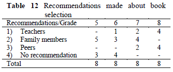 Twenty five students stated that they considered the recommendations made by family members, teachers, and peers when selecting a book. They added that if they, their peers or family members watched a movie based on a book, this would lead to them selecting it. Seven students expressed that they made book selection decisions on their own and did not seek any advice. The findings are presented in Table 12.