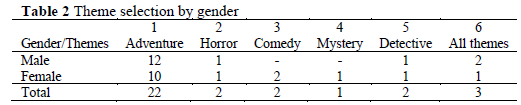 Table 2 shows that the most preferred theme selected by both genders was adventure. This was followed by horror and detective themes, each of which was preferred by one student from each gender. Comedy was preferred by female students with a low frequency of 2. The least preferred theme by both genders was mystery which was preferred by one female student. Three students (two males and one female) stated that they preferred reading books that had any of these five themes. An interesting finding was that female students selected all themes whereas male students did not prefer comedy and mystery; their preferences for horror and detective themes were also significantly low with one selection for each.
