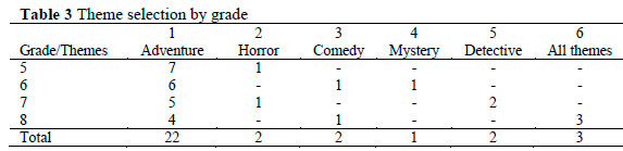 In terms of grade levels, the results in Table 3 show that adventure was once again the most preferred theme. Horror was indicated by only one fifth and one seventh grader. This low frequency was the same for comedy for sixth and eighth graders. Mystery was preferred by only one sixth grader. The detective theme was the second most preferred theme for seventh graders with a frequency of 2. Finally, three eighth graders reported that they would select books in any of those five themes.