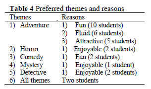 Table 4 presents the students' preferred book themes and reasons for the preference.
