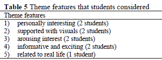 The students stated that, in selecting books to read, they expected a theme to have the features given in Table 5.