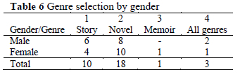 Another principal factor for the selection of books was genre. The students preferred three genres. Table 6 shows that novel was the most preferred genre by both genders. Story was second. Memoir was selected by only one male student and no such preference was reported by female students. A total of three students (two males and one female) reported that they would select any book in any of these three genres.