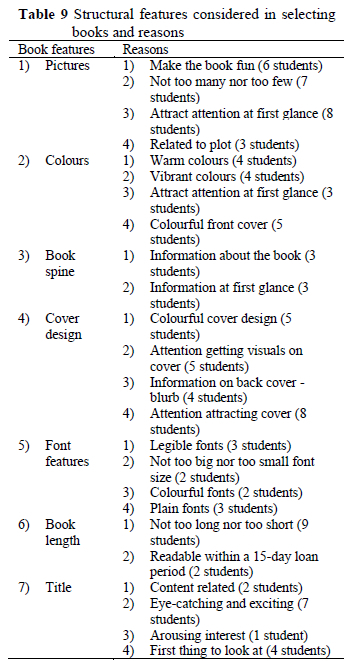 Another feature that the students considered was the colours used on the cover and the interior of the book. Almost 50% of the students stated that they paid attention to the colours used in the layout of a book. They expressed that when the colours used in the design of books were noticeable, vibrant, and matched each other, it made reading them more enjoyable. The structural features that students considered are summarised in Table 9.