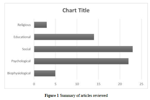 We conducted a review of studies, sampled from all over the world, that sought to explore the impact of the COVID-19 pandemic disruptions on the holistic development of learners. These studies were sourced from the databases of EBSCOhost and Google Scholar. A total of 81 studies were located and reviewed; however, 67 of them qualified for inclusion and 14 were discarded since they did not meet the inclusion criteria. Five articles focused on biophysiological development and how it was influenced by the COVID-19 pandemic. A total of 22 studies explored the impact of the pandemic on psychological development and 23 studies focused on the social development domain. Lastly, 14 studies explored the impact of COVID-19 on educational development and three focused on religious development. Figure 1 depicts the number of articles that were usable in each domain of development.