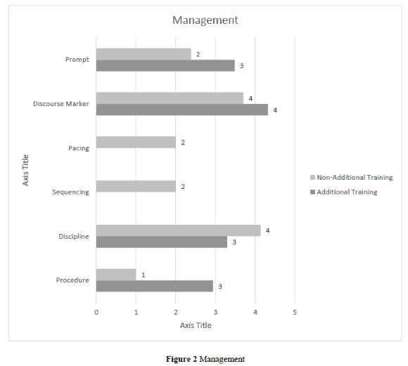 Further triangulation occurs as one examines the categories that fall under "management" in Part A. Here the focus is on three main categories, namely, procedure, pacing, and sequencing. As graphic presentation of the data, a diagram for management is provided in Figure 2. The top, lighter grey bars represent data from Group A (teachers who only used the CAPS), while the bottom, darker bars represent Group B (teachers who used additional training along with the CAPS).