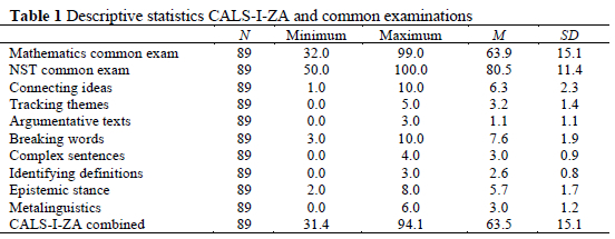 Descriptive statistics were derived for the CALS-I-ZA and the common examination to determine the basic properties of the instruments as shown in Table 1 below.