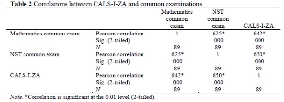 It is important to note that both common examinations' strongest correlations are with the CALS-I-ZA with NST at r = .642 and mathematics at r = .650. It is also important to note that performance on the CALS-I-ZA is significantly related to the results on the common examinations at the 0.01 level. This suggests that the CALS-I-ZA is a moderately strong predictor of academic achievement in mathematics and NST at the Grade 6 level in South Africa, and therefore that it broadly predicts "schooling outcomes."