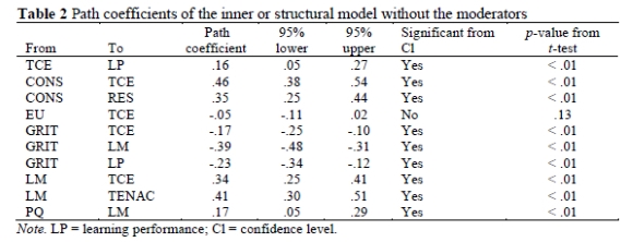 The observed path coefficients revealed that cognitive engagement had a significant and positive effect on learning performance (H1); conscientiousness had a significant and positive effect on cognitive engagement (H2), and learning motivation had a significant and positive effect on cognitive engagement (H3). The impact of EU on cognitive engagement was, however, not significant (H14). Learning motivation also had a statistically significant positive effect on tenacity and hypothesis. H10 could thus be confirmed (Lucas & Spencer, 2018).