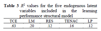 The R2 values reported in Table 3 indicate that not all the endogenous latent variables accounted for a meaningful amount of variance. Only a relatively small proportion of the variance in learning performance (12%) is explained by the exogenous variables. Exogenous variables are the independent variables, while endogenous variables are the dependent variables. In contrast, 63% of the variance in cognitive engagement is explained by its exogenous variables. It should be taken into account that the sample consisted of 395 subjects with largely similar circumstances. The lower variance levels may, therefore, be attributable to little variation in the respondents' circumstances.