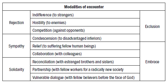 My understanding of mission is in basic agreement with Bosch, that God's mission is a "multifaceted ministry," encompassing dimensions such as "witness, service, healing, reconciliation, liberation, peace, evangelism, fellowship, church planting, earth-keeping, and much more" (Bosch, 1991:512). In other words, acts of covenanting together for social justice and building society as an inclusive home are integral dimensions of God's mission. Since all such forms of mission praxis are aimed at some kind of transformation and involve encounters, my definition of mission also includes the notion of transformative encounters in which Christians are actively engaged. I use the following matrix to explore forms of mission praxis, which in this paper is covenanting together to build society as a shared home of justice and peace (see Kritzinger & Saayman 2011:3-6).