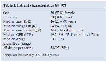 The median age of patients with renal impairment was 46 years; 52% were female; the median number of drugs prescribed per patient was 6 (range 1 - 15) and 55% (53/97) had >5 drugs prescribed. The median eGFR was 19 ml per min per 1.73m2 (IQR 9 - 33), with a median creatinine of 448 µmol/l (IQR 314 - 950) (Table I).