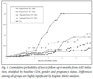 RESULTS: Data from 925 patients (age >14 years, median age 36 years, 70% female, of whom 16% were pregnant) were included: 51 (6%) were lost to follow-up 6 months after ART initiation. Younger age (<30 years) (hazard ratio (HR) 2.14, 95% confidence interval (CI) 1.05 - 4.38) and pregnancy for women (HR 3.75, 95% CI 1.53 - 9.16) were significantly associated with higher LTFU rates. When stratified by baseline CD4 count, gender and pregnancy status, pregnant women with lower baseline CD4 counts (<200 cells/µl) had 6.06 times the hazard (95% CI 2.20 - 16.71) of LTFU at 6 months compared with men.