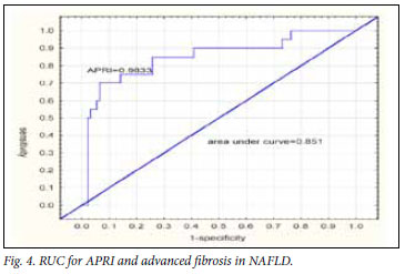 We attempted to validate APRI as a non-invasive marker of advanced fibrosis in subjects with NAFLD. By proving superior sensitivity and specificity of APRI compared with AST/ALT ratio and comparable sensitivity and specificity with NFS, the use of APRI is proposed as part of a simple, user-friendly and reliable algorithm to predict advanced fibrosis in subjects with NAFLD and thereby avoiding liver biopsies for patients with no or minimal fibrosis. Our study confirmed that ALT could neither differentiate between the stage of disease nor the grade of fibrosis. An AST/ALT ratio >0.8 is an indicator of advanced disease. There was a strong tendency in the South African study towards subjects with advanced fibrosis having a higher ratio. However, the ROC curve for AST/ALT ratio and advanced fibrosis was only 0.61, indicating that the positive and negative predictive values were too low to make it a useful tool. APRI is a simple and inexpensive calculation making use of the AST value and platelet count. The formula has been validated in patients with hepatitis C but not in patients with NAFLD. Our study showed that the APRI for South African patients with advanced fibrosis differed significantly from that in patients with less severe disease. The ROC curve for an APRI of 0.98 and detection of advanced fibrosis was 0.85, with positive and negative predictive values of 54% and 94% respectively.