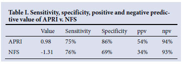 RESULTS: The APRI was significantly higher in the advanced fibrosis group. The area under receiver operating characteristic (ROC) curve for APRI was 0.85 with an optimal cut-off of 0.98, giving a sensitivity of 75% and a specificity of 86%. The NFS was significantly lower in the advanced fibrosis group. The ROC for NFS gave an area under curve (AUC) of 0.77 and a cut-off value of -1.3 with a sensitivity of 76% and specificity of 69%. The positive predictive value for APRI was 54% as opposed to 34% for NFS. The negative predictive value was 93% for APRI and 94% for NFS.