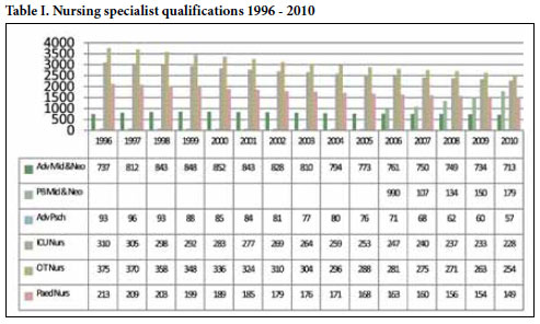 The nursing workforce is reported as ageing, with 46% now over 50 years old and 16% already at retirement age (60) (Table I). The number needed to qualify over the next decade just to replace those retiring and leaving and to sustain the current ratio to population was 51 200. Overall, 70% of new graduates in the key professions over the last 10 years were not absorbed into the public sector, with 80% of physiotherapists and occupational therapists not retained in the public sector.
