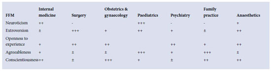 An extensive literature review3that sought to integrate the findings of many studies permits development of a simple table (below), revealing the association between these five main personality traits and the chief career domains. These personalities seem to fit the inherent natures of the jobs. Paediatricians, it can be argued, may naturally experience high levels of anxiety given their responsibility for small, often speechless, patients accompanied by worried ranks of family members. Obstetricians are required to be extra conscientious, arguably because they are responsible for two patients. Anaesthetists may not need to be highly sociable - their patients are unconscious during most of their contact time. Family practitioners are necessarily appropriately highly agreeable and conscientious. Psychiatrists have high emotional stability, which shows in their low neuroticism scores. The surgical stereotype, notable for having a big dominant personality and getting excited about new techniques, seems to be confirmed in high scores for extroversion and openness to experience.