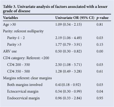 Factors associated with lesser grade or normal cytology are shown in Table 3. A parity of 1 - 2 was associated with twice the chance of having a lesser grade of disease compared with women with no pregnancies. The use of ART reduced the chance of a 'lesser grade of disease' and this association remained in the multivariate analysis when controlling for CD4+ count (results not shown). However, we were unable to assess the length of time that patients were on ART. It may be that ART is commenced when the CD4+ count is already too low, and with more severe immunocompromise. A CD4+ count >200 cells/μ! was associated with lesser grade of disease at follow-up Pap smear, but was only statistically significant for CD4+ counts of 200 - 350 cells/μ!. Incomplete excision of the lesion reduced the chance of a lesser grade of disease on the repeat Pap smear. However, the association failed to reach significance when disease was present only at the endocervical margin.