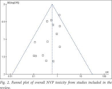 RESULTS: Fourteen studies (2 663 participants) were included for analysis. The odds ratio (OR) for overall NVP toxicity among pregnant women with CD4 <250 cells/! was 0.61 (95% confidence interval (CI) 0.43 - 0.85). When analysis was restricted to prospective studies only (7 studies, 1 318 participants), the results were consistent for overall NVP toxicity (OR 0.43; 95% CI 0.25 -0.73) and severe hepatotoxicity (OR 0.45; 95% CI 0.22 - 0.90), but not for severe cutaneous reaction (OR 0.53; 95% CI 0.26 - 1.10).