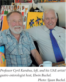 Karabus has a pacemaker and a stent and was held in an Abu Dhabi jail clinic for 57 days with 16 other prisoners. For each of his five bail appearances (the last, on 14 October, was successful, bail being set al R240 000) some 50 - 100 prisoners were lined up in the hot sun in the prison courtyard, shackled hand and foot, while their names were called, the now grey-bearded oncologist told Izindaba. Bagraim singled out the Anglican Church of Abu Dhabis' Reverend Canon Andy Thompson, contacted by Archbishop Desmond Tutu, as having been pivotal in helping make Karabus' life 'more comfortable'. Izindaba made contact with Karabus at the hotel he was staying at with his wife shortly after his 20 November hearing. He spent most of his time with Pretoria-trained gastro-enterologist and acclaimed artist Elwin Buchel, a UAE veteran of 11 years. Karabus said he was forced to grow his beard after prison officials took away his razor, but 'left it on in an attempt to appear older' at the numerous bail hearings. 'It didn't work very well,' he joked.