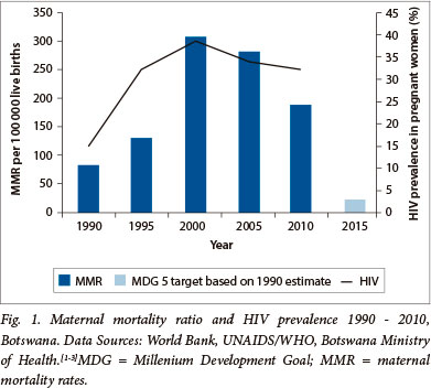 Although the Government of Botswana has made considerable inputs into health services delivery, the country's maternal mortality ratio (MMR) has not declined sufficiently to meet the 2015 Millennium Development Goal 5 target of 21 per 100 000 (Fig. 1).[1-3] The rise in deaths between 1995 and 2000 is attributed to the corresponding rise in HIV prevalence in women[1-3] and to improved notifications following the establishment of the maternal mortality monitoring system in 1998.[4] Research in Southern Africa now shows the emerging predominance of indirect causes of maternal deaths over direct causes, mainly linked to HIV and non-pregnancy-related infections. This calls for radical changes in the approach to preventing maternal mortality.[5-7] The UNAIDS Global Plan has now set a target of halving HIV-related maternal deaths by 2015.[8]