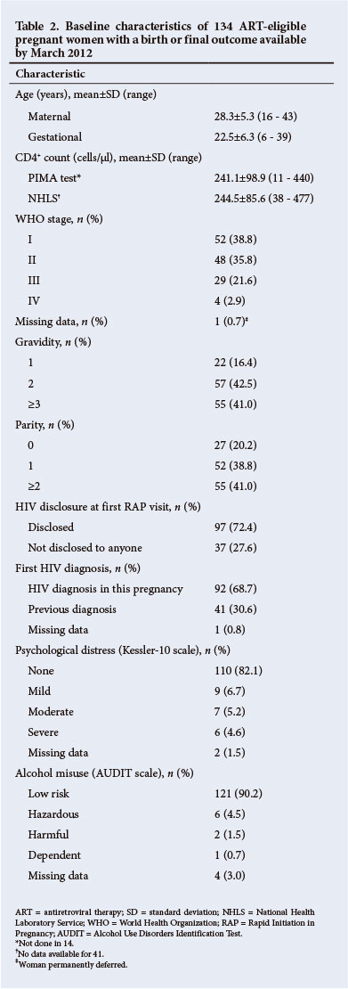 Table 2 describes the baseline demographic and clinical characteristics of the cohort. The mean age of the participants was 28 years, with a mean gestational age at presentation of 23 weeks (range 6 - 39 weeks). The mean CD4+ cell count was 241 cells/µl for the PIMA and 244 cells/µl for the NHLS results. Ninety-two women (68.7%) were diagnosed during their current pregnancy, and 37 participants (27.6%) did not disclose their status before their first RAP visit.