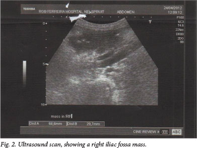 An ultrasound scan on 24 April 2012 at RFH revealed a large mass of para-aortic lymph nodes, with a poorly circumscribed RIF mass of 69 x 30 mm (Fig. 2). The liver and spleen were normal and no renal calculi were seen. The gynaecology team ruled out pelvic inflammatory disease. The Surgery Unit requested a computed tomography (CT) scan of the abdomen and a sputum specimen for tuberculosis (TB) diagnosis (no record of the latter could, however, be found).