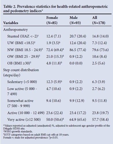 The methodology behind these cross-sectional data is described in detail elsewhere.'41 Briefly, 7-day accelerometry-based pedometry data and anthropometric measures were obtained from 178 male and female adolescents (age range 13.7 - 18.0 years) residing in the Dikgale HDSS site across six villages varying in infrastructure and amenities. Only 26 participants were recruited from three villages (Ntsima, Ga-Tjale, Moduane), and because these three villages are geographically closely linked they were combined. The study was approved by the Ethics Committee of the University of Limpopo.