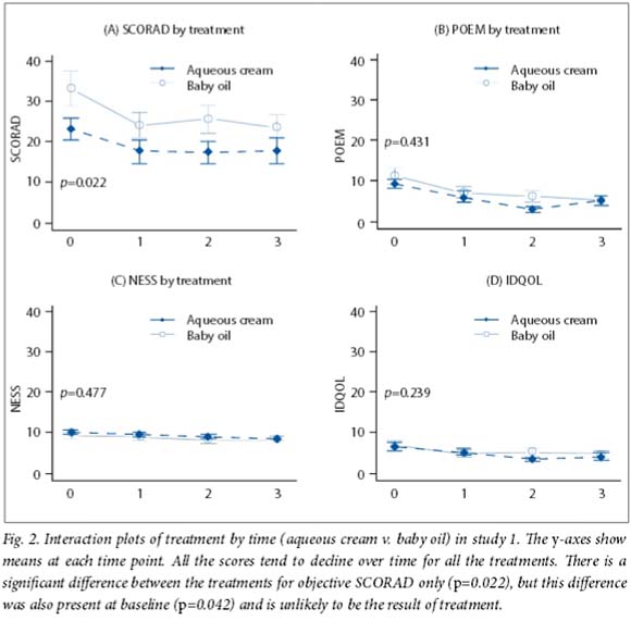 Data were analysed using STATA version 13.1.[18] With an estimate of proportions of 33% v. 5% and a non-inferiority margin of 5%, the total sample size was 40 (20 per group for study 1). In the paralleldesign study, with the same parameters as above with adjustment for multiple testing, the total sample size was 44 x 2 = 88 (22 per groupfor study 2). We compared SCORAD/NESS/POEM and IDQOL mean scores at baseline and weeks 4, 8 and 12 and summarised the findings by treatment group and time with interaction plots produced using R Version 3.0.2.[19] We used repeated-measures analysis of variance which utilised all data and assessed the effect of treatment and time effect (interaction between time and treatment) using generalised estimating equations. The level of significance was set at p<0.05.