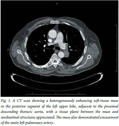 A 67-year-old man with a 40 pack-year smoking history presented with a 2-year history of hoarseness and weight loss. He also had a history of asbestos exposure. On examination under anaesthesia a lesion of the right false vocal fold was found and histology showed a moderately differentiated infiltrating keratinising squamous carcinoma. A subsequent computed tomography (CT) scan provisionally staged his supraglottic carcinoma as T2N0M0 and he underwent radical treatment with external beam radiation therapy, to which he responded well. He had been attending our clinic regularly and remained well, but on a visit 4 years later possible recurrence was considered - with hilar lymphadenopathy noted on his chest radiograph. On the CT scan of his chest there was a heterogenously enhancing soft-tissue mass (42 mm x 30 mm) in the posterior segment of the left upper lobe, adjacent to the proximal descending thoracic aorta, with a tissue plane between the mass and mediastinal structures appreciated. The mass demonstrated encasement of the left main pulmonary artery (Fig. 1). There was also a left diaphragmatic calcified plaque. The question posed was whether this mass could be ascribed to metastatic supraglottic carcinoma or if it was indeed a metachronous primary bronchus carcinoma, as the treatment of these two malignancies differs significantly. Considering traditional bronchoscopy with TBNA as the least invasive procedure to obtain a cytological diagnosis, the proximity of the aorta and pulmonary arteries and the mass being 14 mm from the bronchus would have made sampling by means of this procedure near impossible. With the assistance of EBUS the mass was localised, despite it not abutting the bronchus, and the position of the major vessels duly noted on Doppler ultrasound. Under real-time ultrasound guidance (Fig. 2) the tissue plane between the mass and bronchial lumen could be bridged by the longer EBUS needle to traverse safely between the major vessels, a window of <10 mm, and obtain a fine-needle aspirate of the mass. The result, which proved to be a keratinising squamous carcinoma (Fig. 3), was most likely of supraglottic origin. The patient was discharged the same day, with a follow-up appointment to see an oncologist.