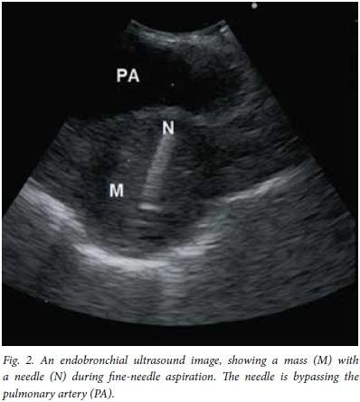 Conventional TBNA (cTBNA) has a history of >3 decades of use for mediastinal sampling in lung cancer, especially in more bulky disease. Traditionally, patients presenting with mediastinal lymphadeno-pathy would undergo conventional bronchoscopy and TBNA done blindly, while reserving mediastinoscopy for cases where cTBNA failed to elucidate a final diagnosis. There is now increased use of EBUS-TBNA, whereby needle aspirations are no longer done blindly but under real-time ultrasound guidance. There are two types of EBUS probes: the radial probe EBUS (RP-EBUS) and convex probe EBUS (CP-EBUS). RP-EBUS provides 360° images of the airway wall and surrounding structures. The major advantage of RP-EBUS is its ability to visualise the layers of the airway wall in detail. CP-EBUS provides a view parallel to the shaft of the bronchoscope - the angle of view is 90° and the direction of view is 30° forward oblique. Colour flow and Doppler features permit identification of vascular, ductular, and cystic structures. The major advantage of CP-EBUS is its ability to guide real-time sampling. The dedicated 22-gauge needle has an echogenic dimpled tip to enhance visibility on ultrasound. The maximum extruding stroke is 40 mm, with a safety mechanism that stops at 20 mm. The needle has an internal sheath, which prevents contamination of the sample by bronchial wall tissue.