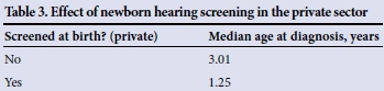 METHODS: A comparative study design was utilised and a retrospective database review conducted. Data obtained from this study in the private healthcare sector were compared with data from a previous study in the public healthcare sector using the same study design. RESULTS: Forty-eight children aged <6 years with disabling hearing impairment (DHI) were identified in the private healthcare sector during the study period; 33/47 (70.2%) did not undergo hearing screening at birth. The median age of diagnosis of DHI in the private healthcare sector was 2.24 years, and this was statistically significantly lower than the median age of diagnosis of 3.71 years in the public healthcare sector (p<0.0001; 95% confidence interval (CI) 0.99 - 2.0). The median age of diagnosis of CHL in the private healthcare sector was 3.01 years in children who were not screened at birth, and 1.25 years in those who were screened at birth. This difference was statistically significant (p<0.01; 95% CI 0.72 - 2.47). We also compared the median age of diagnosis of CHL in children from the private healthcare sector who were not screened at birth (median 3.01 years) with that in children in the public healthcare sector (median 3.71 years). This difference was statistically significant (p<0.01; 95% CI 0.41 - 1.56).