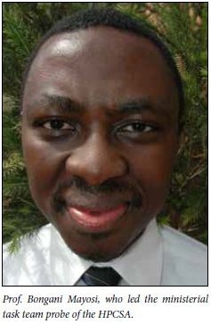 Mayosi's fact-finding probe - widely and correctly predicted to be hard-hitting and without fear or favour - comes after the HPCSA Board failed to act on damning earlier forensic reports, or to claim hefty court-ordered legal fees from its Chief Operating Officer, Advocate Tshepo Boikanyo. Boikanyo, along with Chief Executive Officer Buyiswa Mjamba-Matshoba and Head of Legal Services Phelelani Khumalo, refused to give evidence to the ministerial task team that found them 'unfit for office'. Boikanyo had earlier taken the HPCSA to court for not accepting his application to be CEO -losing with costs. The money was never recouped from him, while a KPMG forensic report concluding that he was involved in 'unauthorised, irregular and/or fruitless and wasteful expenditure' was ignored. The KPMG findings centred on the purchase of an Oracle Information Technology system, the cost of which ballooned from ZAR14 million to around ZAR40 million. Mayosi's task team said that Mjamba-Matshoba's refusal to appear before them 'justifies the