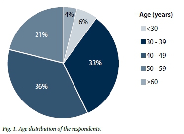 One hundred questionnaires were handed out, and there was a 70% response rate. Fifty (71%) of the respondents were male, and the majority (69%) were between 30 and 49 years of age. Fig. 1 illustrates the age distribution of respondents. The majority had been involved in burn care for 5 - 10 years (36%) and 11 - 20 years (31%), with 16% involved for <5 years, 14% for 21 - 30 years and 3% for >30 years.
