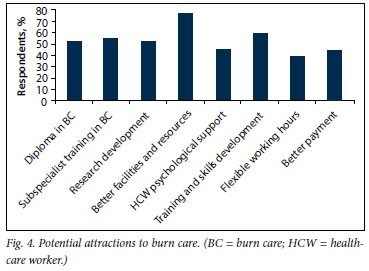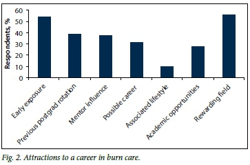 Asked why they had become involved in burn care in SA, 54% cited early exposure (as a student, intern or medical officer) to burn care and 39% exposure at a postgraduate level. Mentor influence during training was cited by 37%, 31% seeing burn care as a possible career path and 56% believing it to be a rewarding field (Fig. 2).