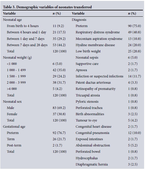 METHODS. A prospective study was conducted from December 2011 to January 2012. A quantitative, non-experimental design was used to undertake a descriptive analysis of 120 inter-healthcare facility transfers of neonates within the eThekwini Health District (Durban) of KwaZulu-Natal Province, South Africa. Data collection was via questionnaire. Data collection was restricted to the Emergency Medical Services (EMSs) of eThekwini Health District, which is the local public ambulance provider.