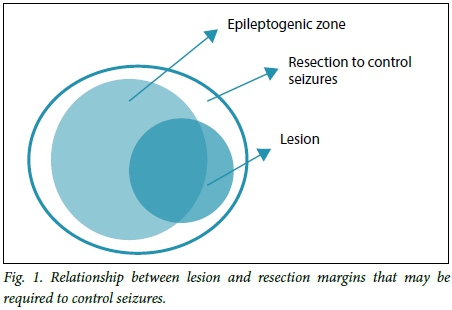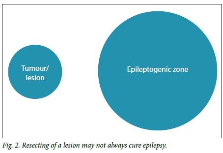 It is important to stress the difference between tumour surgery and epilepsy surgery. In tumour surgery the focus is on removing the lesion and the malignant infiltrates in the surrounding tissue, which are often not visible under a microscope. Various techniques are used to allow visualisation of this infiltrated area, e.g. amino-acid PET masking. Traditionally, this approach is used in epilepsy surgery associated with lesions, such as developmental neuro-ectodermal tumours. The belief is that the lesion is epileptogenic; therefore, performing a lesionectomy is all that is required to control the seizures. However, epilepsy surgeons are aware that, in some cases, this does not control the epilepsy (Figs 1 and 2 illustrate this principle). Part of the work-up for epilepsy surgery takes this into account and great effort is made to search for the epileptiform cortex, even more distant from the lesion. This is why in epilepsy surgery the term topectomy is preferred rather than lesionectomy.