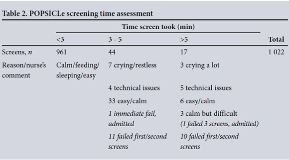 RESULTS: During the 4-month study period, 1 017 of 2 256 babies discharged (45.1%) were offered POx screening and 1 001 were screened; 94.0% of tests took <3 minutes to perform, 4.3% 3 - 5 minutes and 1.7% >5 minutes. Eighteen patients needed second screens and three required third screens. Only 3.1% protocol errors were made, all without consequence. The vast majority (91.6%) of nursing staff reported insufficient time to perform the study screening in addition to their daily tasks, but ~75% felt that with a full nursing staff complement and if done routinely (not part of a study), pre-discharge POx screening could be successfully instituted at our facility. Over 98% of the mothers had positive comments. Two babies failed screening and required echocardiograms; one was diagnosed with CCHD and the other with neonatal sepsis. The sensitivity and specificity were 50% (95% confidence interval (CI) 1.3 - 98.7%) and 99.9% (95% CI 99.4 - 100%), respectively, with a percentage correct of 99.8%.