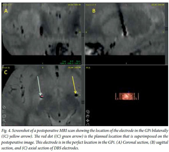 The procedure is performed in one of two ways by most centres. Two different techniques are used to confirm the placement of the electrode in the chosen target. Fig. 1 summarises the procedures. The most common technique uses micro-electrode recording (MER) to confirm placement of the electrode. With this technique, a very thin electrode monitors the electrical activity at an individual neuronal level as it is passed through the brain parenchyma. The STN and GPi have characteristic electrical waveforms that are readily recognised by experienced neurosurgeons and neurophysiologists. Accuracy is therefore confirmed on a physiological level and the best electrode position is chosen during the surgical procedure. The same electrode can be used for stimulation, thereby checking for side-effects and unplanned effects on nearby structures, such as the optic tract or the internal capsule. Repositioning is then possible, during which the patient needs to be awake. Fig. 2 is an intraoperative image of this procedure. It may be difficult to perform in the elderly and younger children with dystonia, where the abnormal movements are so violent that the patient cannot be kept still in the head frame. Another approach, and the one I prefer, is to perform the entire procedure under general anaesthesia. The patient has the stereotactic frame applied, a stereotactic MRI brain scan is performed, and the target planning is done while the patient is anaesthetised. Once the planning has been done, the frame is applied over the frame base (Fig. 3) and the procedure is performed. Two burr holes are made behind the hairline and the electrodes are placed directly on the selected target. After placement of both electrodes a stereotactic MRI scan is performed again and imaging verification is done to confirm the position of the electrode in the chosen target (Fig. 4). If the placement is accepted, the implantable pulse generator (IPG) is inserted in theatre; if not, the electrode is first repositioned and then the procedure is completed. Frame-based stereotaxis is still the gold standard worldwide - the patient is fitted with a stereotactic frame that is bolted to the head - but there are some units that perform frameless stereotactic techniques.