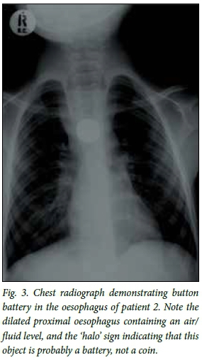 Small children frequently ingest foreign bodies. [1] The true incidence of this is unknown, and most foreign bodies will pass through the gastrointestinal tract unnoticed and without causing any harm.[2] Large or unusually shaped objects, however, may become lodged in the oesophagus and require endoscopic removal or advancement into the stomach. Button batteries need to be dealt with particularly urgently as they cause complications that can lead to extensive morbidity and even mortality. We describe two cases of missed battery ingestion seen in Cape Town, South Africa, that led to extensive morbidity, requiring surgical management that would not have been necessary had the batteries been removed timeously. of the oesophageal mucosa was noted at the time of endoscopy. Four days later, when the patient's symptoms had not settled, he underwent a computed tomography (CT) scan of the chest, which demonstrated a tracheo-oesophageal fistula (Fig. 1). At this point he was referred to Red Cross War Memorial Children's Hospital (RCWMCH), Cape Town.