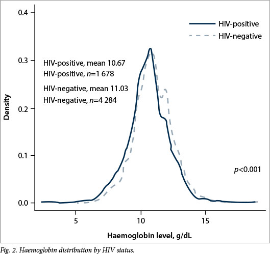 For women with a CD4 >350 cells/μl, DNH (62.1%) had the highest ART coverage, followed by CMH (45.2%) and FH (10.2%; p<0.0001). HIV-negative women had a mean haemoglobin of 11.03 g/dL compared with 10.67 g/dL in HIV-positive women (p<0.001) (Fig. 2). Of the 234 women who were transfused, 82 (35.0%) were HIV-positive.