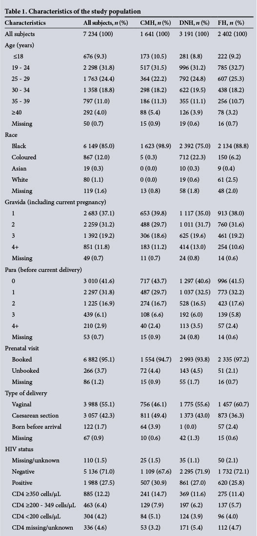 A total of 7 234 women were enrolled in the study (Table 1). The majority of the participants were aged 19 - 29 years and 9.3% were <18 years. The racial distribution was predominantly black and coloured. The women were mostly gravida 1 or 2 and para 0 or 1. More than 95% of the women had received antenatal care. The majority of births were normal vaginal deliveries, but there were high rates of caesarean section; 1.7% of births occurred before arrival at the hospital. Overall, 27.5% of the patients were HIV-positive and prevalence varied slightly by site.