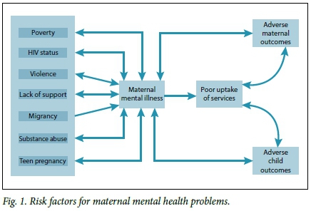 A previous history of mental illness is one of the strongest risk factors for CMDs during pregnancy[5] In SA, where there is a large treatment gap, this risk is usually unknown. Other factors that increase the likelihood of women developing a CMD during and after pregnancy are social rather than biological, and these are exacerbated by poverty. Lack of social support, including emotional and financial support from partner, friends or community, intimate partner violence, an unintended or unwanted pregnancy, low levels of education, adolescent pregnancy, and alcohol and substance use comprise key risk factors.[6] Women living in poverty may encounter food insecurity, which carries other risks for the developing fetus. These and other risk factors are highlighted below.