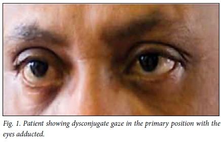 As demonstrated in Fig. 1, the patient had dysconjugate gaze in the primary position with the eyes adducted (turned toward the nose bridge). Fluctuating esotropia was present. When the object for fixation was held closer than 30 cm to examine the eye movements, the patient developed convergence and miosis was noted to occur synergistically. When eye movements were tested separately, they were normal with full range of pursuit movements and saccades. Bilateral contraction of the orbicularis oculi muscles was also noted. No other cranial nerve abnormalities or long tract signs were observed. The diagnosis of convergence spasm (spasm of the near reflex) was made.