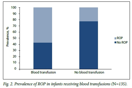 RESULTS. Three hundred and thirteen ROP examinations were performed in 135 of 191 eligible infants. The mean GA and BW were 30.1 weeks (standard deviation (SD) 1.9) and 1 056 g (SD 172), respectively. ROP was diagnosed in 40 infants (29.6%); 8 (5.9%) had severe ROP and 2 (1.5%) received laser treatment. Infants with ROP had a lower mean GA (29.2 weeks (SD 1.6) v. 30.5 weeks (SD 1.9)) (p<0.002) and a lower mean BW (988 g (SD 181) v.1 085 g (SD 160)) (p=0.001) than those without ROP. Infants weighing <1 000 g had a 2.5 times higher risk than those with a BW of >1 000 g of having ROP (95% confidence interval 1.05 - 5.90; p=0.03). Blood transfusions (p<0.002) and late-onset sepsis (p=0.024) were strongly associated with ROP. Screening was completed in 91.1% (123/135) of the infants.
