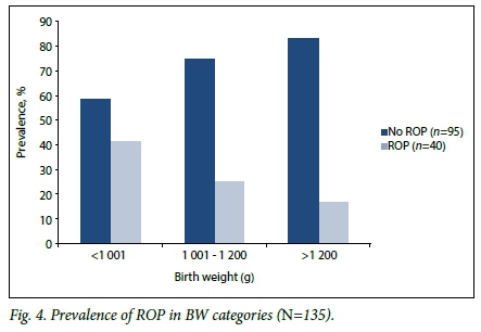 On multivariate analysis, GA at birth was the only variable independently associated with ROP (risk ratio (RR) 0.85, 95% confidence interval (CI) 0.740 - 0.988; p=0.03). If GA was excluded, BW (RR 0.99, 95% CI 0.997 - 0.999; p=0.03) and blood transfusions (RR 1.71,95% CI 1.027 - 2.859; p=0.03) were independently associated with ROP. ELBW infants had a 2.5 times higher risk of having ROP than infants with a BW >1 000 g (95% CI 1.05 - 5.90; p=0.03). The prevalence of ROP according to BW is described further in Fig. 4.
