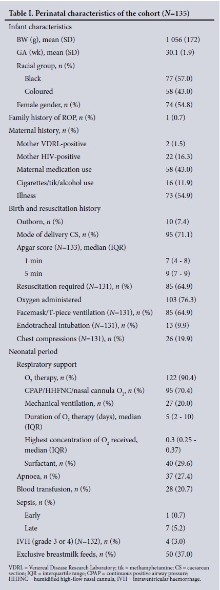 Screening was performed in 135 of the 191 eligible infants. Fig. 1 shows the derivation of the final dataset. The prespecified perinatal characteristics of the cohort are shown in Table 1. The mean GA and BW were 30.1 weeks (standard deviation (SD) 1.9) and 1 056 g (SD 172), respectively. Seventy-four infants (54.8%) were female. Only black (57.1%) and coloured (42.9%) infants were represented in the sample. One infant had a family history of ROP.